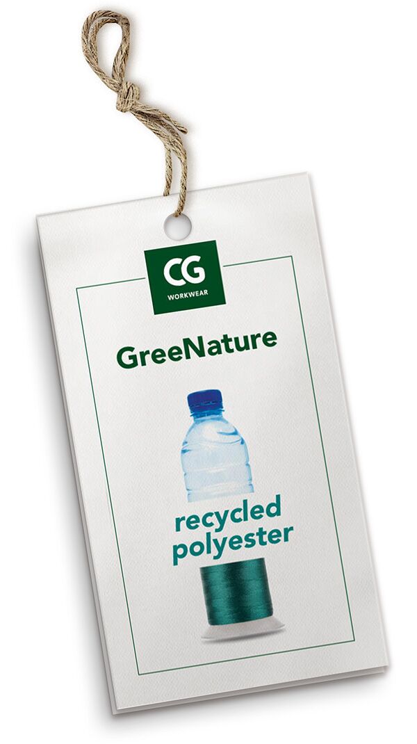 Plastik aus Recyclingcontainern sowie gebrauchte PET Flaschen werden zer­klei­nert, zu Polyestergarn gesponnen und mit Bio-Baumwolle zu Gewebe ­verarbeitet. Bei CG kommt das Material als Kollektion GreeNature wieder in den Kreislauf. Es verbindet Nachhaltigkeit und Umweltschutz mit den hohen Anforderungen an professionelle Berufsbekleidung.